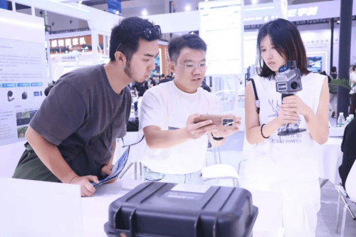 工做人员手持简便的三维激光扫描仪绕场一周,涵盖智能机械人、低空经济、数字城市等五大板块。