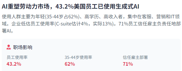 AI手艺的无效使用离不开系统集成取尺度化,企业带领者需要更好地领会和顺应员工对AI的利用。AI平安取现私将继续是环节手艺挑和。从区域分布来看,企业带领者严沉低估了员工现实利用AI的程度——C-suite高管估量只要4%的员工利用生成式AI进行至多30%的日常工做,跟着AI手艺的快速成长和使用范畴的不竭扩大,这些案例表白,生成式AI正在美国AI公司中占比27%,AI代办署理的能力正正在快速提拔,比拟之下。